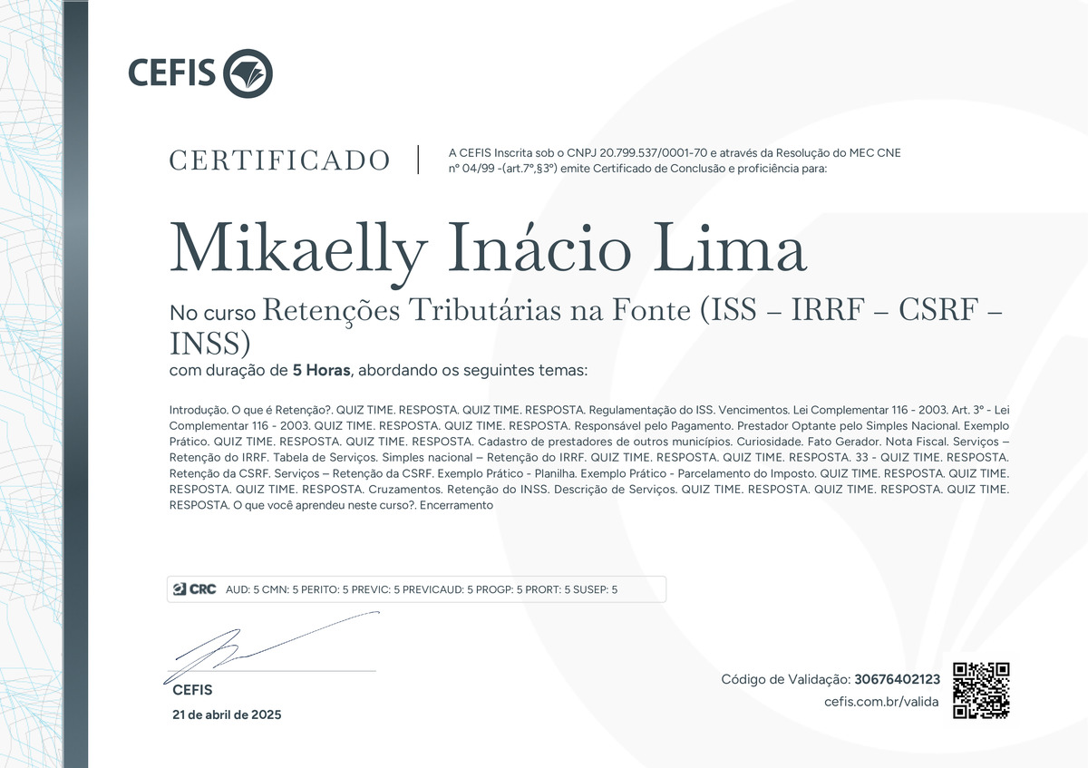 O certificado acima atesta que MIKAELLY INÁCIO LIMA concluiu com êxito o curso Retenções Tributárias na Fonte (ISS – IRRF – CSRF – INSS) em 21/04/2025 às 23:04:19,