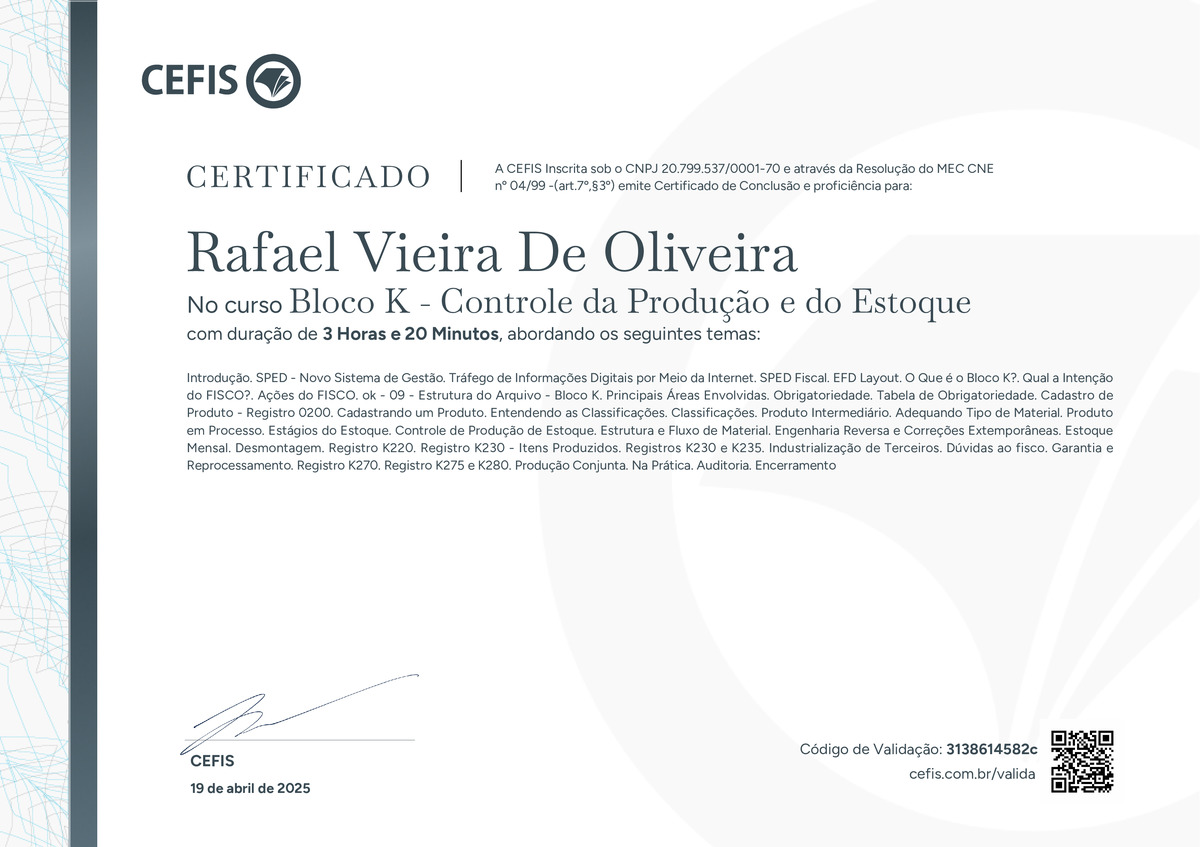 O certificado acima atesta que RAFAEL VIEIRA DE OLIVEIRA concluiu com êxito o curso Bloco K - Controle da Produção e do Estoque em 19/04/2025 às 11:04:12,