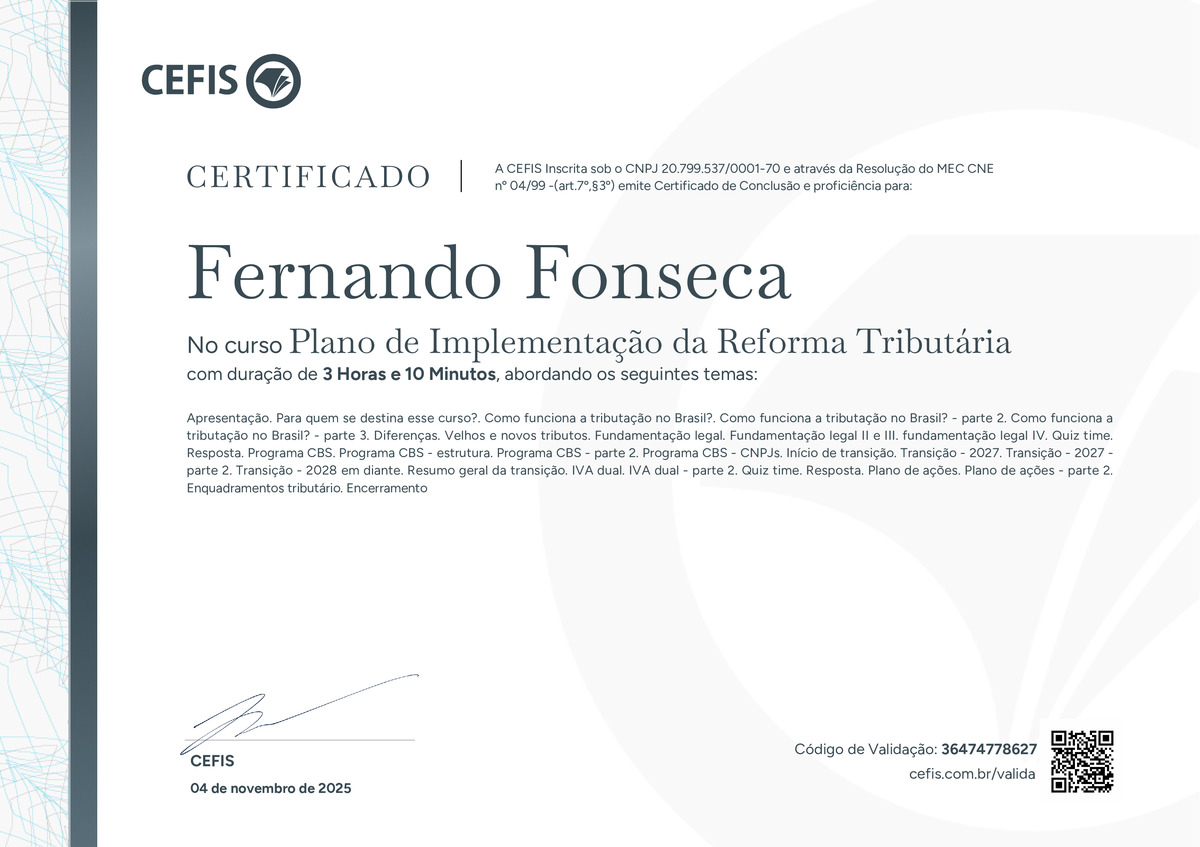O certificado acima atesta que FERNANDO FONSECA concluiu com êxito o curso Plano de Implementação da Reforma Tributária em 04/11/2025 às 14:11:25,