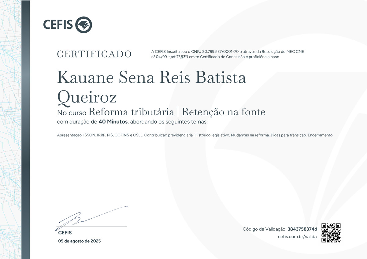 O certificado acima atesta que KAUANE SENA REIS BATISTA QUEIROZ concluiu com êxito o curso Reforma tributária | Retenção na fonte em 05/08/2025 às 17:08:42,