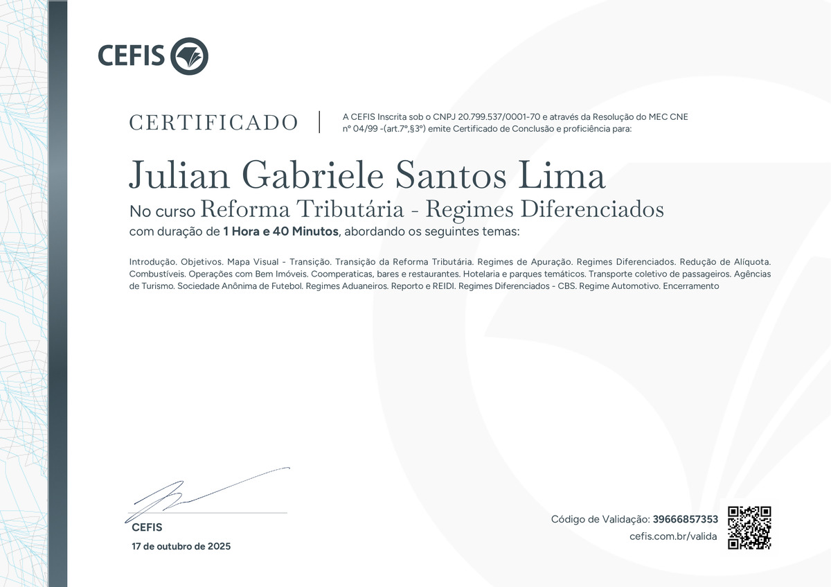 O certificado acima atesta que JULIAN GABRIELE SANTOS LIMA concluiu com êxito o curso Reforma Tributária - Regimes Diferenciados em 17/10/2025 às 10:10:47,