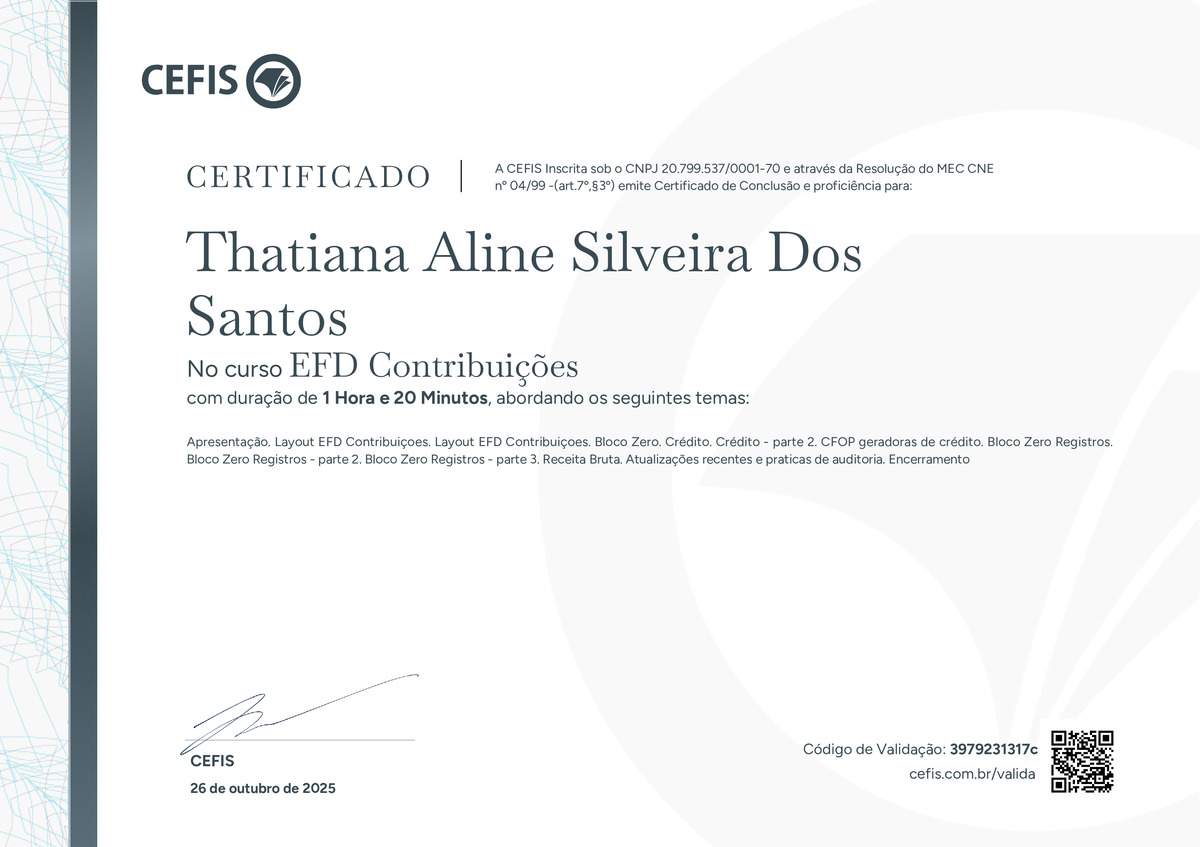 O certificado acima atesta que THATIANA ALINE SILVEIRA DOS SANTOS concluiu com êxito o curso EFD Contribuições em 26/10/2025 às 21:10:06,