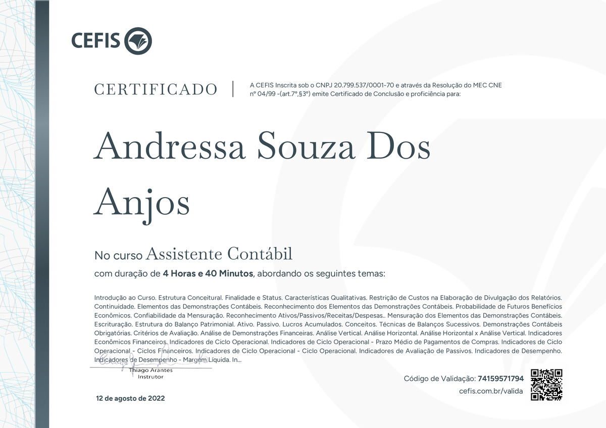 O certificado acima atesta que ANDRESSA SOUZA DOS ANJOS concluiu com êxito o curso Assistente Contábil em 12/08/2022 às 08:08:53,