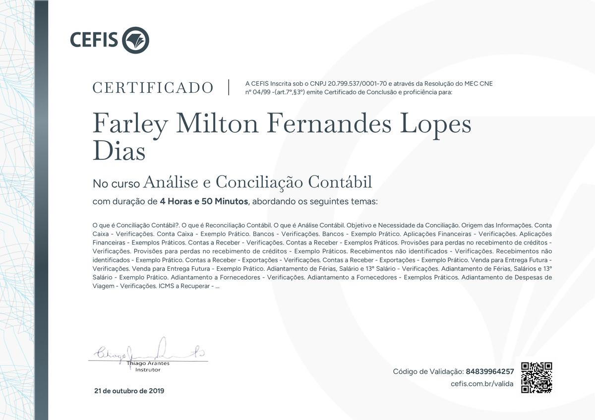 O certificado acima atesta que FARLEY MILTON FERNANDES LOPES DIAS concluiu com êxito o curso Análise e Conciliação Contábil em 21/10/2019 às 01:10:59, ministrado por THIAGO ARANTES.