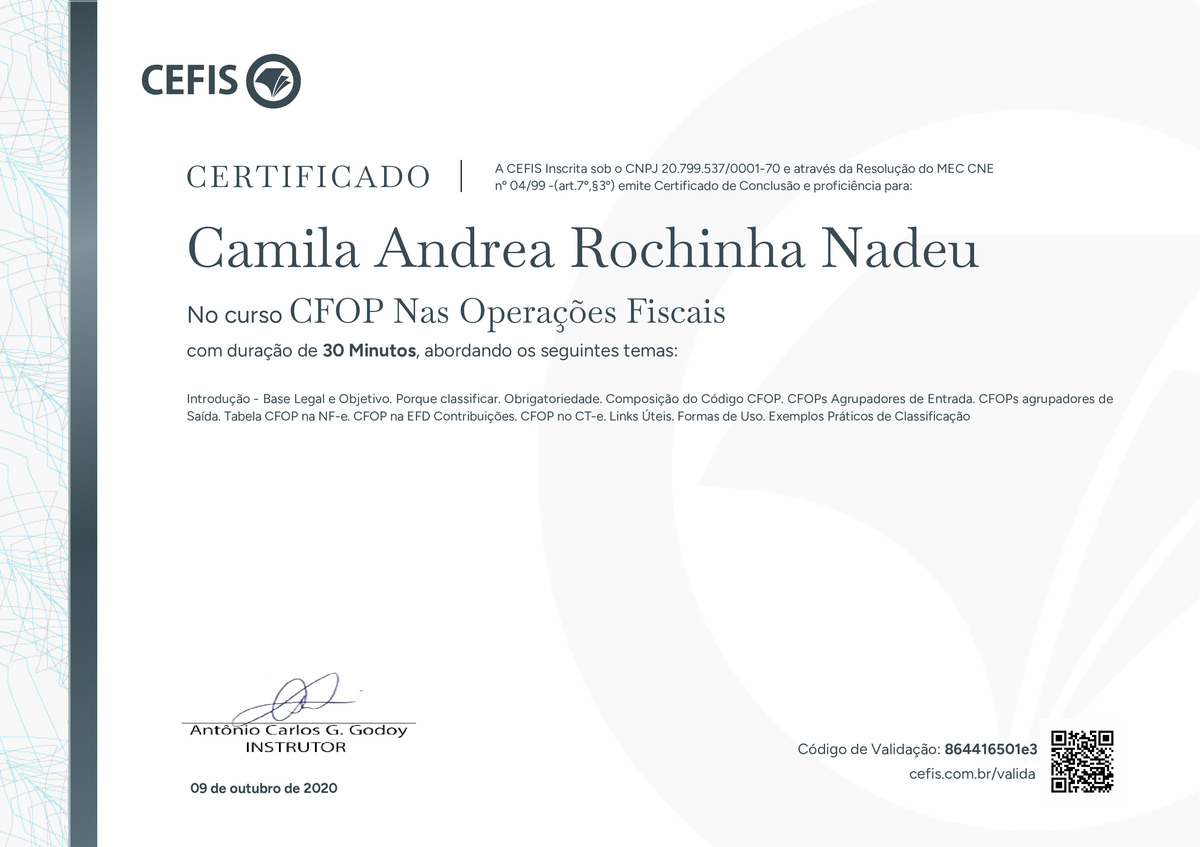 O certificado acima atesta que CAMILA ANDREA ROCHINHA NADEU concluiu com êxito o curso CFOP Nas Operações Fiscais em 09/10/2020 às 11:10:07,