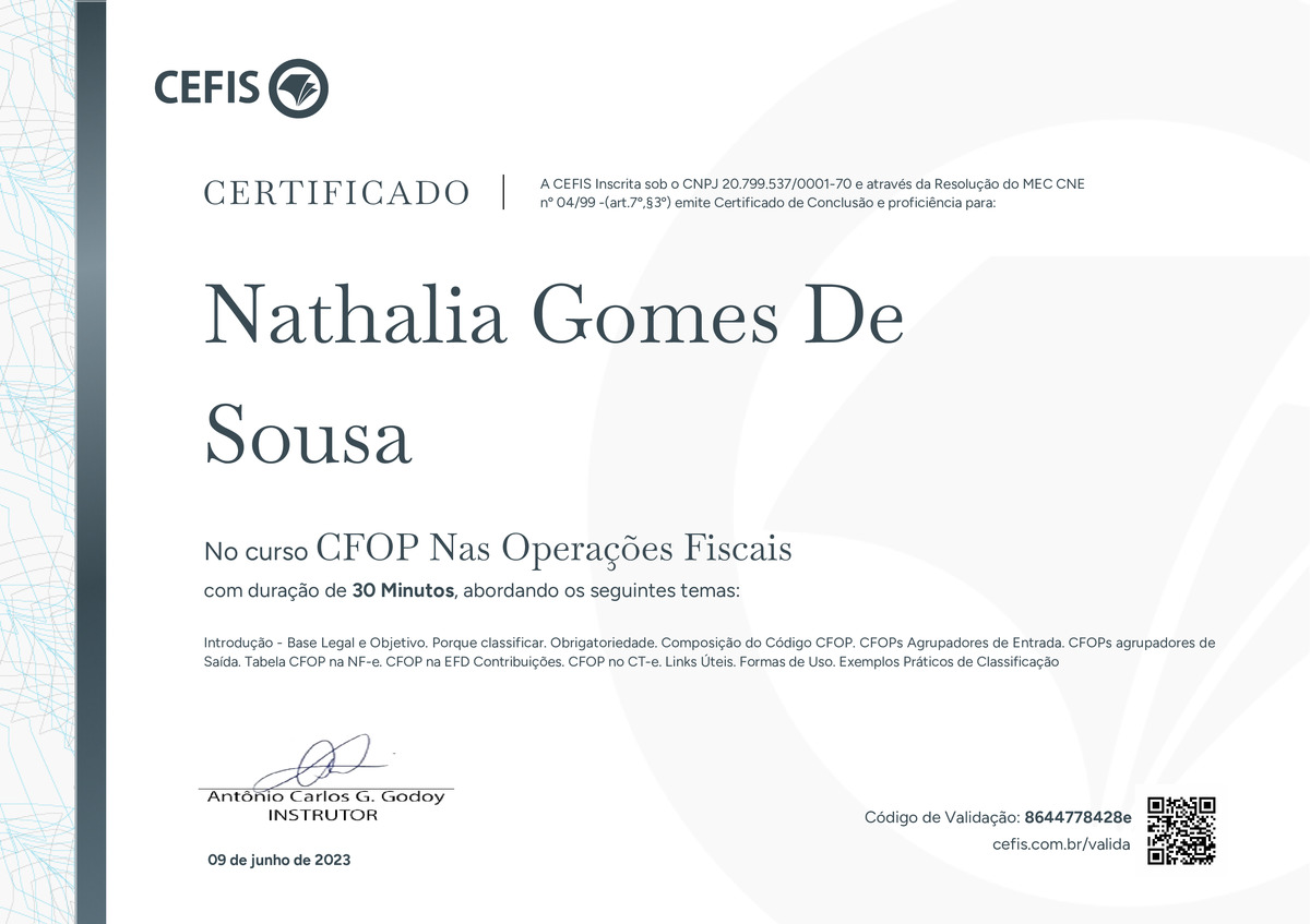 O certificado acima atesta que NATHALIA GOMES DE SOUSA concluiu com êxito o curso CFOP Nas Operações Fiscais em 09/06/2023 às 13:06:35,
