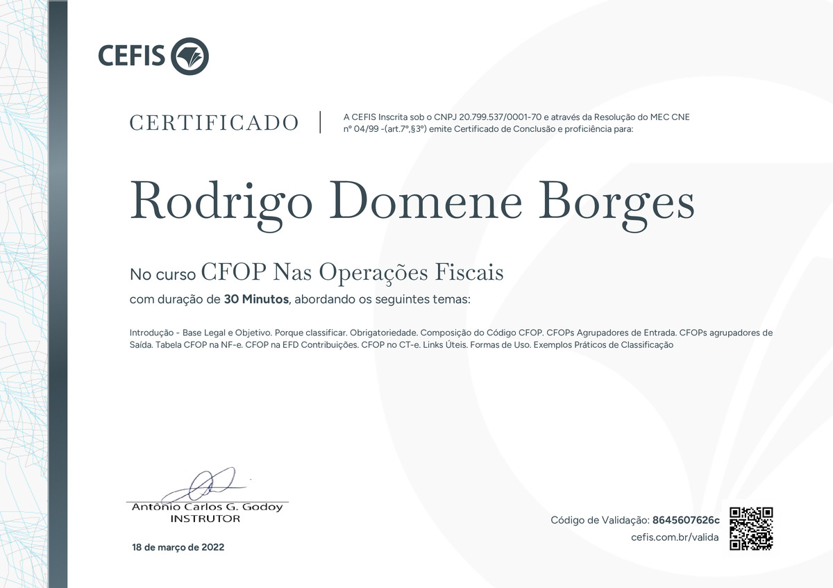 O certificado acima atesta que RODRIGO DOMENE BORGES concluiu com êxito o curso CFOP Nas Operações Fiscais em 18/03/2022 às 11:03:37, ministrado por Antônio Carlos Godoi.