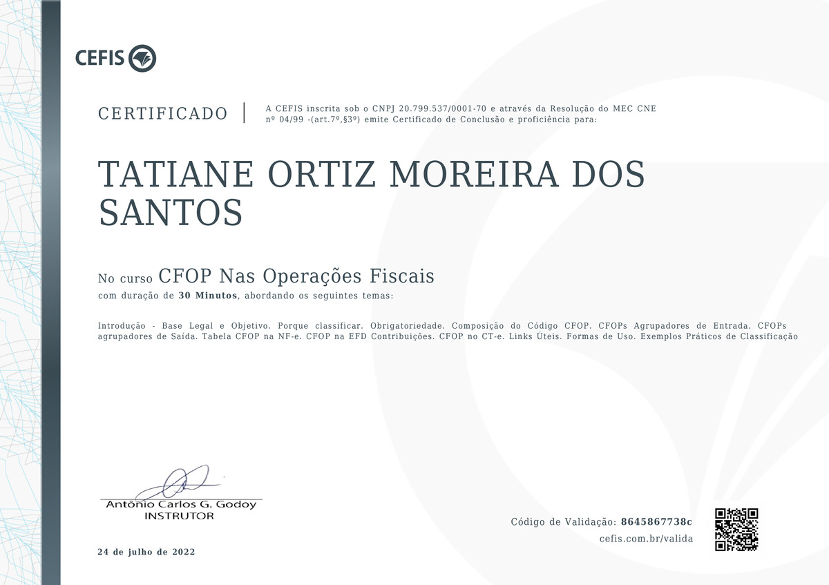 O certificado acima atesta que TATIANE ORTIZ MOREIRA DOS SANTOS concluiu com êxito o curso CFOP Nas Operações Fiscais em 24/07/2022 às 22:07:40, ministrado por Antônio Carlos Godoi.