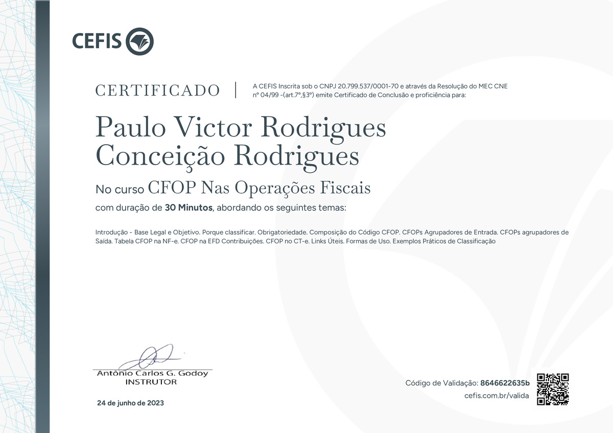 O certificado acima atesta que PAULO VICTOR RODRIGUES CONCEIÇÃO RODRIGUES concluiu com êxito o curso CFOP Nas Operações Fiscais em 24/06/2023 às 12:06:25, ministrado por Antônio Carlos Godoi.