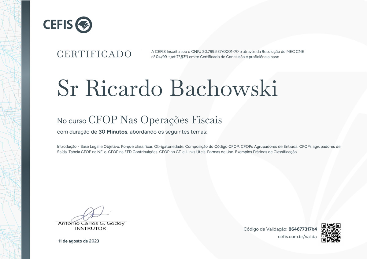 O certificado acima atesta que SR RICARDO BACHOWSKI concluiu com êxito o curso CFOP Nas Operações Fiscais em 11/08/2023 às 17:08:43, ministrado por Antônio Carlos Godoi.