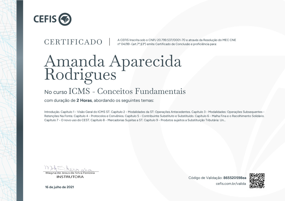 O certificado acima atesta que AMANDA APARECIDA RODRIGUES concluiu com êxito o curso ICMS - Conceitos Fundamentais em 16/07/2021 às 18:07:53,
