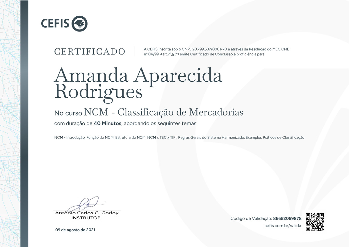 O certificado acima atesta que AMANDA APARECIDA RODRIGUES concluiu com êxito o curso NCM - Classificação de Mercadorias em 09/08/2021 às 19:08:34,