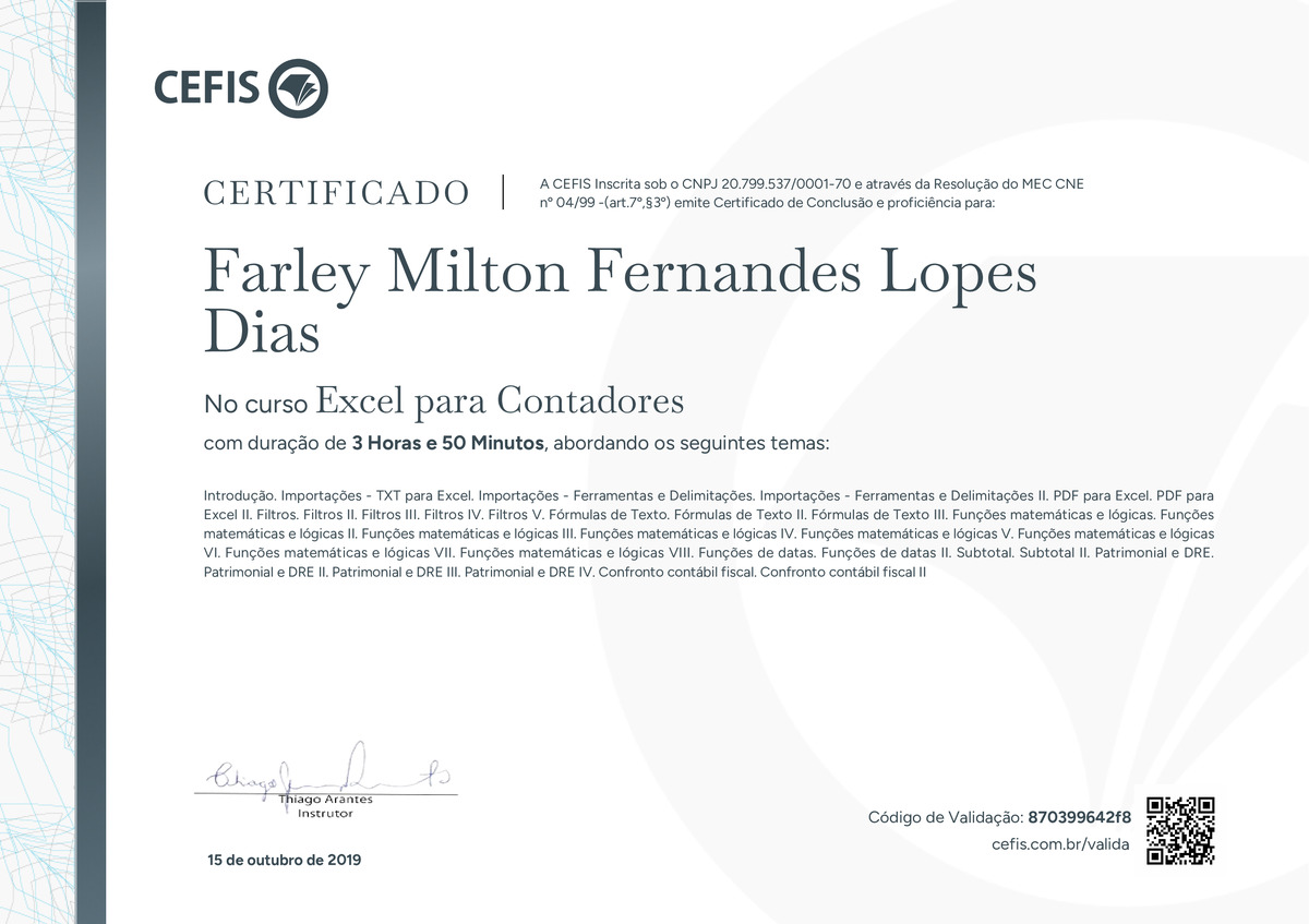O certificado acima atesta que FARLEY MILTON FERNANDES LOPES DIAS concluiu com êxito o curso Excel para Contadores em 15/10/2019 às 02:10:07,