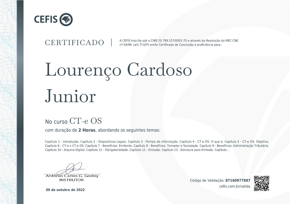 O certificado acima atesta que LOURENÇO CARDOSO JUNIOR concluiu com êxito o curso CT-e OS em 09/10/2022 às 15:10:43,