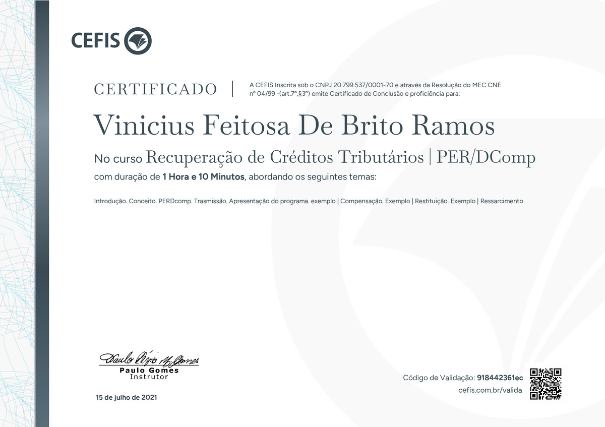 O certificado acima atesta que VINICIUS FEITOSA DE BRITO RAMOS concluiu com êxito o curso Recuperação de Créditos Tributários | PER/DComp em 15/07/2021 às 23:07:46,