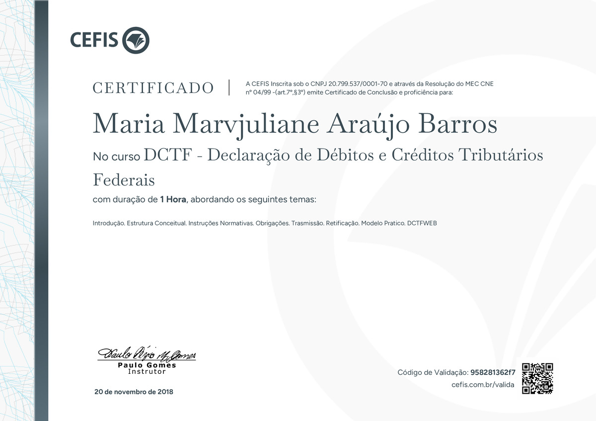 O certificado acima atesta que Maria Marvjuliane Araújo Barros concluiu com êxito o curso DCTF - Declaração de Débitos e Créditos Tributários Federais em 20/11/2018 às 17:11:15,