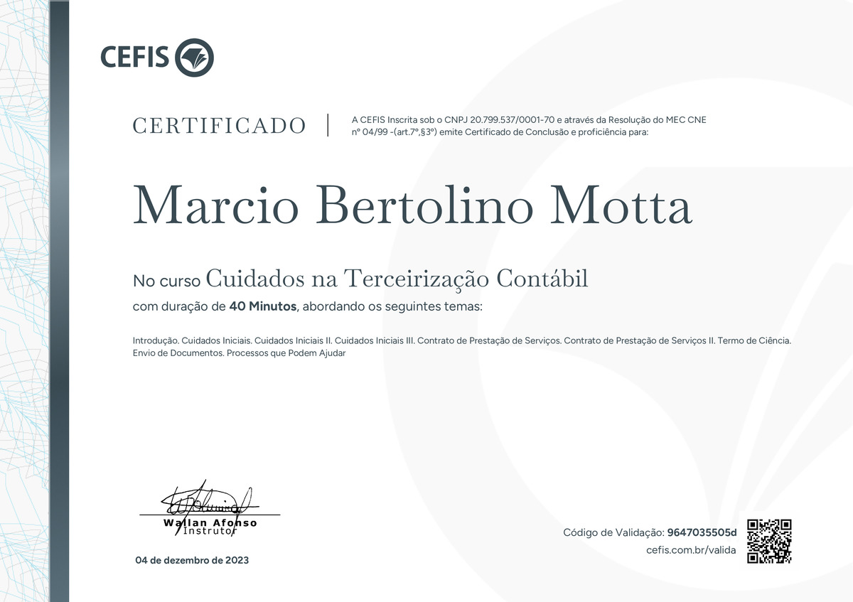 O certificado acima atesta que MARCIO BERTOLINO MOTTA concluiu com êxito o curso Cuidados na Terceirização Contábil em 04/12/2023 às 09:12:36,